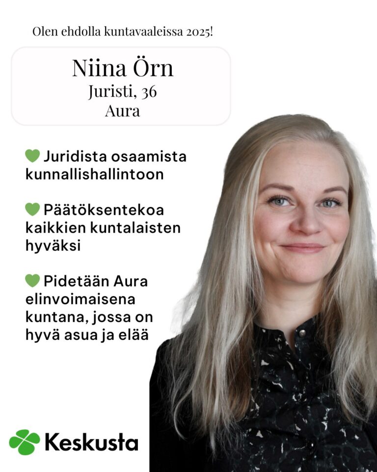 Kuntapolitiikkaan pyrin nyt ensimmäistä kertaa mukaan, jännittävää! Toivon saavani riittävästi ääniä, jotta pääsen mukaan vaikuttamaan siihen, että Aurassa on hyvä asua nyt ja tulevaisuudessakin; kuntamme tulee pysyä elinvoimaisena ja toivottavaa on, että sen vetovoimaisuus asuinkuntana jopa kasvaisi.