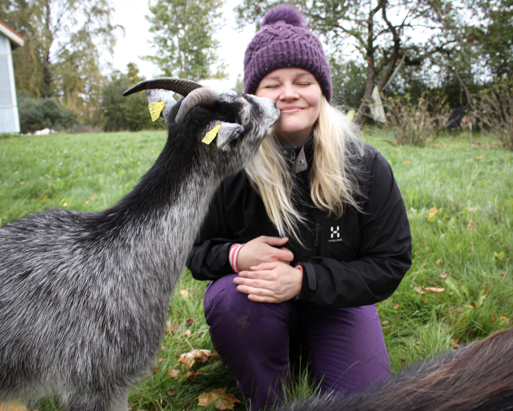 Vuohien kanssa ulkoilemassa kotipihallamme